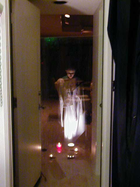 If you are doing a garage walkthrough, you may be able to use the hallway leading from the house to the garage to your advantage. The actor can stand in a room adjacent to the inside hall (In this case, the laundry room), and the glass is placed in the hall. If your glass is not large enough to cover the entire hall, the inside garage door can be opened to obscure one side of the glass. You will need to use some other method to conceal the top edge of the mirror. I angled a board across the door frame, giving the effect of a condemned building and obscuring the top edge. Pepper's Ghost in my 2000 Haunt:
