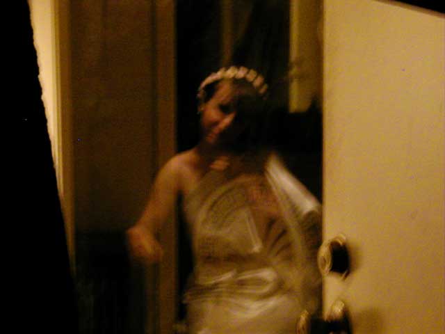 At our Halloween 2000 Haunt, the inside rooms adjacent to the inside hall unfortunately did not work for Pepper's Ghost. We needed to actually build an artificial room in the garage for our actor to stand in. The walls of this room were made out of fabric, like the rest of our haunt, and doubled so that no light would shine through. We had a fence high enough that people could not lean far over, and made sure that a fabric wall blocked the actor from view if someone did. We hid the visible edge of the glass by opening the door slightly behind it. This made the edge of the glass look more like part of the door. Back |