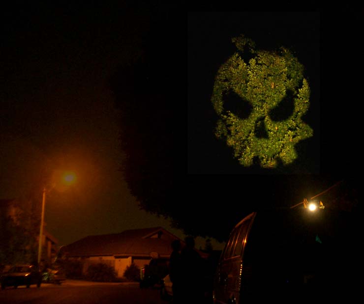 For this effect, you must have a large tree near your haunt or some other surface to project the image onto. Position the slide projector up high, so guests will not get in the way of the projection. I put the projector on top of our van and ran an extension cord well above the walkway. Experiment with the projector to find the best placement of the image on the tree. Keep in mind that there will appear to be more distortion of the image the further away you are from the slide projector. If you can, I recommend adding a color filter to the slide. The Completed Effect: