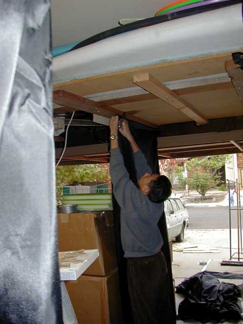 ceiling; cardboard was stapled flat against the walls and shelves; props were stapled into