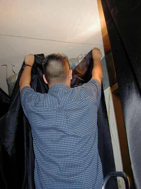 To ensure that the staples didn't rip the fabric when stapling it to the ceiling and walls, we cut small squares of cardboard and placed them so that they would be stapled between the staple and the fabric. This proved to be extremely helpful. The pieces of fabric that were not cushioned with cardboard had a tendancy to rip where the staple was. Also, during tear down, we only had to grab the cardboard square and pull to remove the staple, rather than using pliers or a screwdriver like we needed when removing the staples that we had not used cardboard with, saving us a considerable amount work.