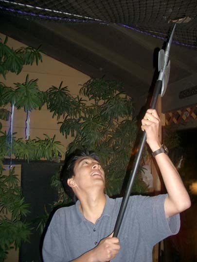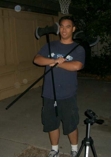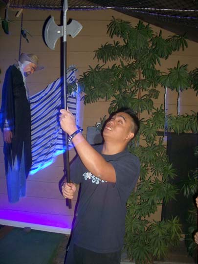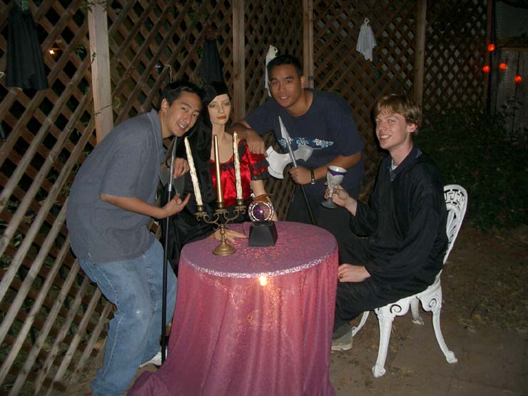 We went up to the window to get a picture of us with the billowing ghost, too. All three of us crowded in around the apparition as close to the window as possible to pose for the camera. As we stood there, looking down on my dad with the camera, we all began to wonder, "Do you think he's taken the picture yet?" We waited for a minute or so until we were pretty sure he had gotten a shot, and we turned to head back downstairs. In the process, we managed to knock over the ghost and send the blue lightbulb soaring into the bookshelves. In the total darkness, I was on the floor feeling around for a broken lightbulb, while Mike and Victor tried to get the ghost back on the table. It was at that moment, of course, that a camera flash illuminated the window. Guest Reactions Dr. No, our fanimatronic received the most guest reactions. I overheard several of the older guests talking to each other as they tried to determine if it was a real person or not. Some of the younger trick-or-treators were afraid of it. One small toddler didn't notice it when he first came into the patio. As he started to walk out, though, he saw the ghoul for the first time, with it's head moving slowly back and forth, and he froze in his tracks, refusing to go any closer. It wasn't until after a good deal of coaxing from his dad and brother that the kid finally worked up the courage to run out of the patio and past the ghoul. Back |