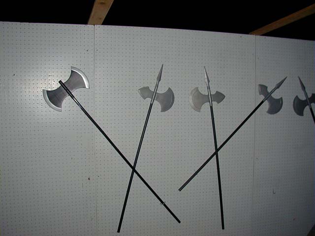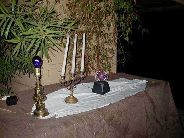 Haunts: 2001 Walkthrough Entire Walkthrough | Open Floor Plan in New Window After entering through the creaky door of the entrance, guests found themselves in a dimly lit hallway. Since this hallway was actually outside of the house, some decorating needed to be done in order to hide some of the plants and make it appear more like a normal hall. A wire-frame shelf was placed over the planter extending from the house, and a brown tarp was draped over that so that it would appear to be a table. On this table, we placed a black light, a candlabra, and one of those electric ball thingies. This gave the hallway an eerie purple glow. The other side of the hallway was pegboard from the backside of our false entrance. Here, we secured several fake weapons such as you might see in a medieval castle.