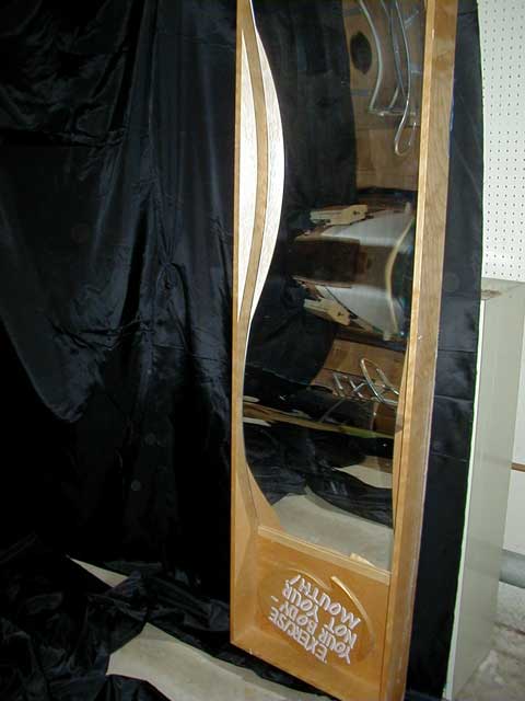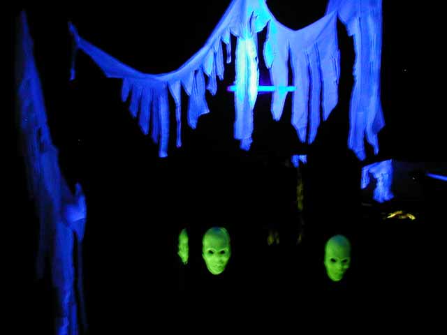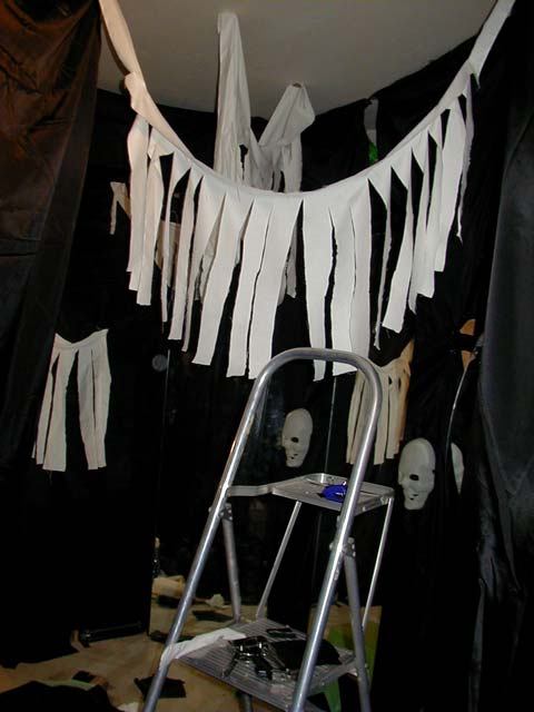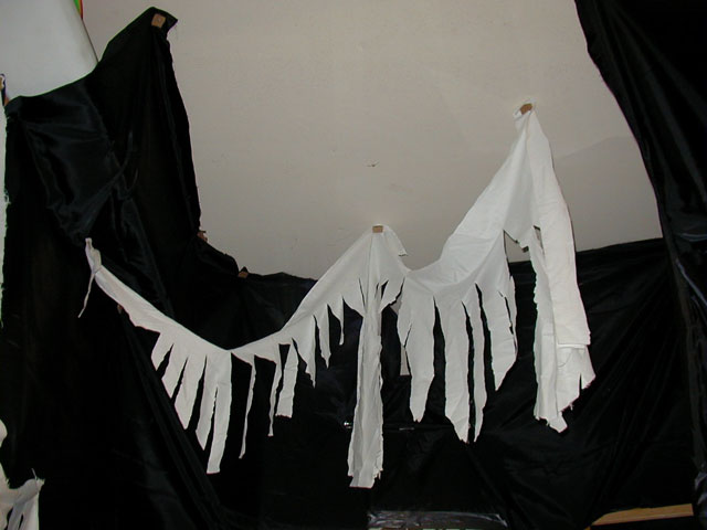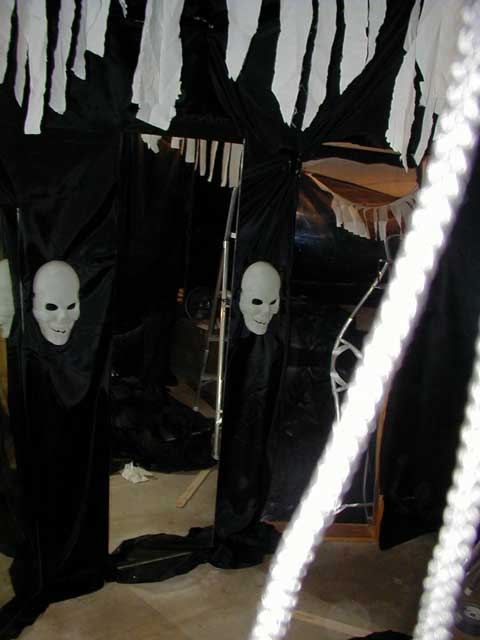 Haunts: 2001 Walkthrough Entire Walkthrough | Open Floor Plan in New Window This year, we replaced Halloween 2000's Black Light Room with a Mirror Hallway. Two flat, full-length mirrors and one wavy, fun house mirror (Which I bought for $20 at a thrift store) were secured along one wall. Shredded strips of white fabric draped from the ceiling and glowed eerily in the two flourescent style black lights. Striped bed sheets carpet this section of our haunt, also glowing under the black lights. To top off the scene, two glow-in-the-dark skull masks glowed brightly from their mounts on the wall. The mirrors reflected the hanging fabric and striped sheets, creating a spooky and disorienting effect.