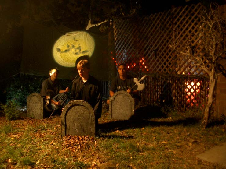 For the cemetery, I used the tombstones that I had made for my 2001 haunt and stretched a large