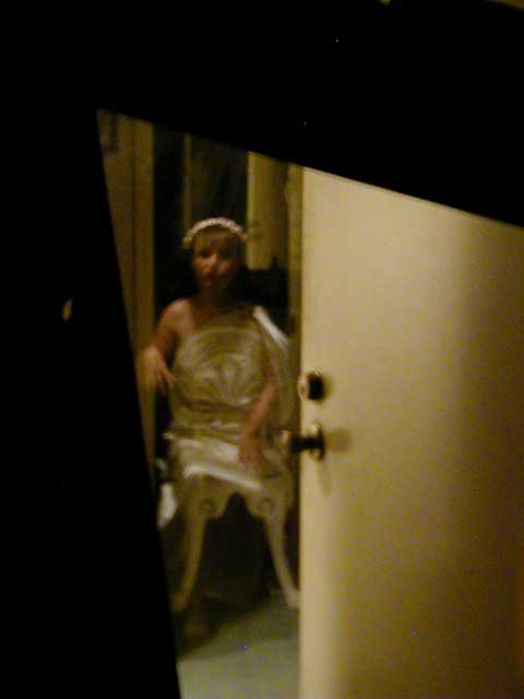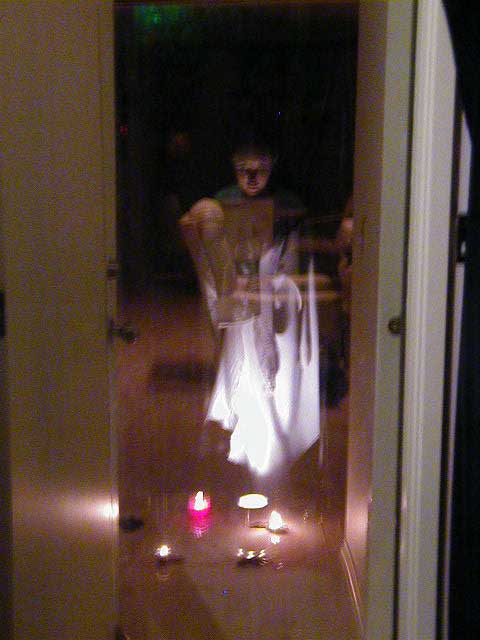 At our Halloween 2000 Haunt, the inside rooms adjacent to the inside hall unfortunately did not work for Pepper's Ghost. We needed to actually build an artificial room in the garage for our actor to stand in. The walls of this room were made out of fabric, like the rest of our haunt, and doubled so that no light would shine through. We had a fence high enough that people could not lean far over, and made sure that a fabric wall blocked the actor from view if someone did. We hid the visible edge of the glass by opening the door slightly behind it. This made the edge of the glass look more like part of the door. Back |