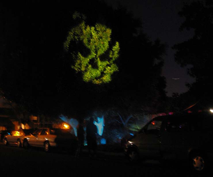 For this effect, you must have a large tree near your haunt or some other surface to project the image onto. Position the slide projector up high, so guests will not get in the way of the projection. I put the projector on top of our van and ran an extension cord well above the walkway. Experiment with the projector to find the best placement of the image on the tree. Keep in mind that there will appear to be more distortion of the image the further away you are from the slide projector. If you can, I recommend adding a color filter to the slide. The Completed Effect: