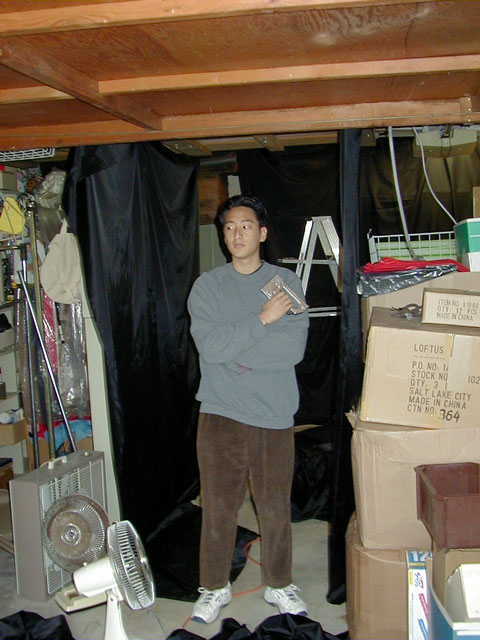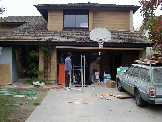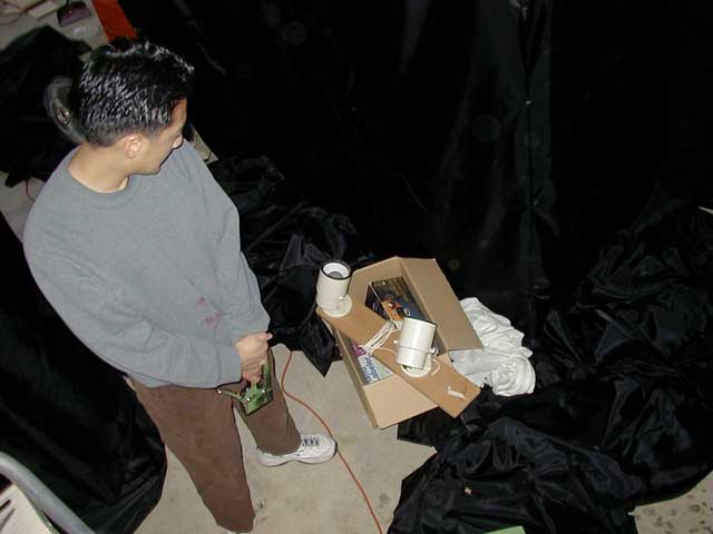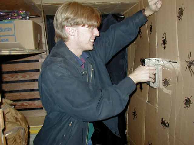 Haunts: 2001 Planning and Set-up: Building the Haunt It Could've Been Worse I was pretty much on my own for set-up this year, and I planned to start during the weekend. Halloween fell on a Thursday, so that gave me just over one week to put everything together. The weekend was exceptionally important for set-up, as I would need to be focusing on school work during the week to be sure that I would be free on Halloween night. In preparation for the weekend set-up, I started clearing out what I could from the garage. It was then that I discovered a leak in the water heater. Fixing this, apparently, was more important to my parents than the success of my haunt, and I was forced to wait until Sunday afternoon, after the plumber had come, before I could use that half of the garage. This, of course, did not completely prevent me from setting up; I worked nailing up cardboard and spray painting bugs the entire time the plumber was there. In fact, he even said that he'd stop by on Halloween, although some great tragedy must have befallen him, for I never saw him again.