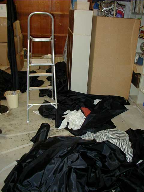 The other thing that made this year's set-up more straight forward than last year's was the fact that our layout was extremely inflexible and already established. Most of the shelves in the garage could not be moved, so I knew exactly where the walkway would need to go, and I could plan the props and effects in relation to that. These shelves also gave us a very sturdy framework for the haunt, and something into which we could staple more cardboard, fabric, and props. Last year, we had not only needed to determine and lay out where the walkways would go, but we also needed to construct an elaborate framework to hold our haunt together. The fact that Pepper's ghost would not require any additional construction also helped a great deal. Much of the most difficult work involved in our 2000 Haunt was not required this year.