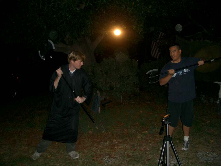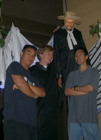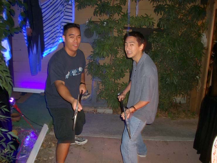 We went up to the window to get a picture of us with the billowing ghost, too. All three of us crowded in around the apparition as close to the window as possible to pose for the camera. As we stood there, looking down on my dad with the camera, we all began to wonder, "Do you think he's taken the picture yet?" We waited for a minute or so until we were pretty sure he had gotten a shot, and we turned to head back downstairs. In the process, we managed to knock over the ghost and send the blue lightbulb soaring into the bookshelves. In the total darkness, I was on the floor feeling around for a broken lightbulb, while Mike and Victor tried to get the ghost back on the table. It was at that moment, of course, that a camera flash illuminated the window. Guest Reactions Dr. No, our fanimatronic received the most guest reactions. I overheard several of the older guests talking to each other as they tried to determine if it was a real person or not. Some of the younger trick-or-treators were afraid of it. One small toddler didn't notice it when he first came into the patio. As he started to walk out, though, he saw the ghoul for the first time, with it's head moving slowly back and forth, and he froze in his tracks, refusing to go any closer. It wasn't until after a good deal of coaxing from his dad and brother that the kid finally worked up the courage to run out of the patio and past the ghoul. Back |